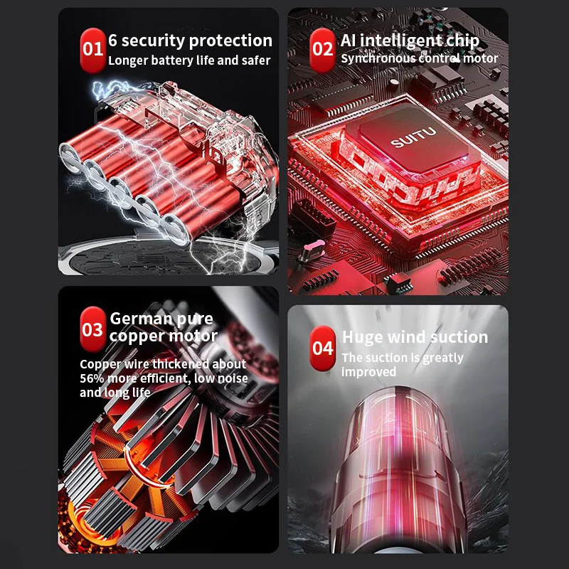 This portable vacuum is battery-powered for cordless convenience, with fast recharge capability. The transparent dust container allows easy monitoring and quick emptying. Ideal for car interiors, office desks, furniture, or travel use, this vacuum combines portability, power, and efficiency in one compact device.